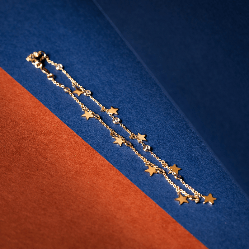 Completează-ți look-ul cu această brățară fermecătoare de picior din aur galben, decorată cu steluțe și pietricele. Descoperiți rafinamentul și eleganța cu această brățară subtilă, perfectă pentru a adăuga un strop de feminitate și strălucire.